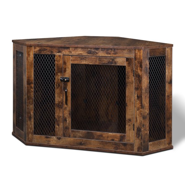 HOBBYZOO Furniture Corner Dog Crate, Lockable Doors, Dog Kennel with Wood and Mesh, Dog Crate for Small/Medium Dogs, Pet Crate Furniture, Dog House, S