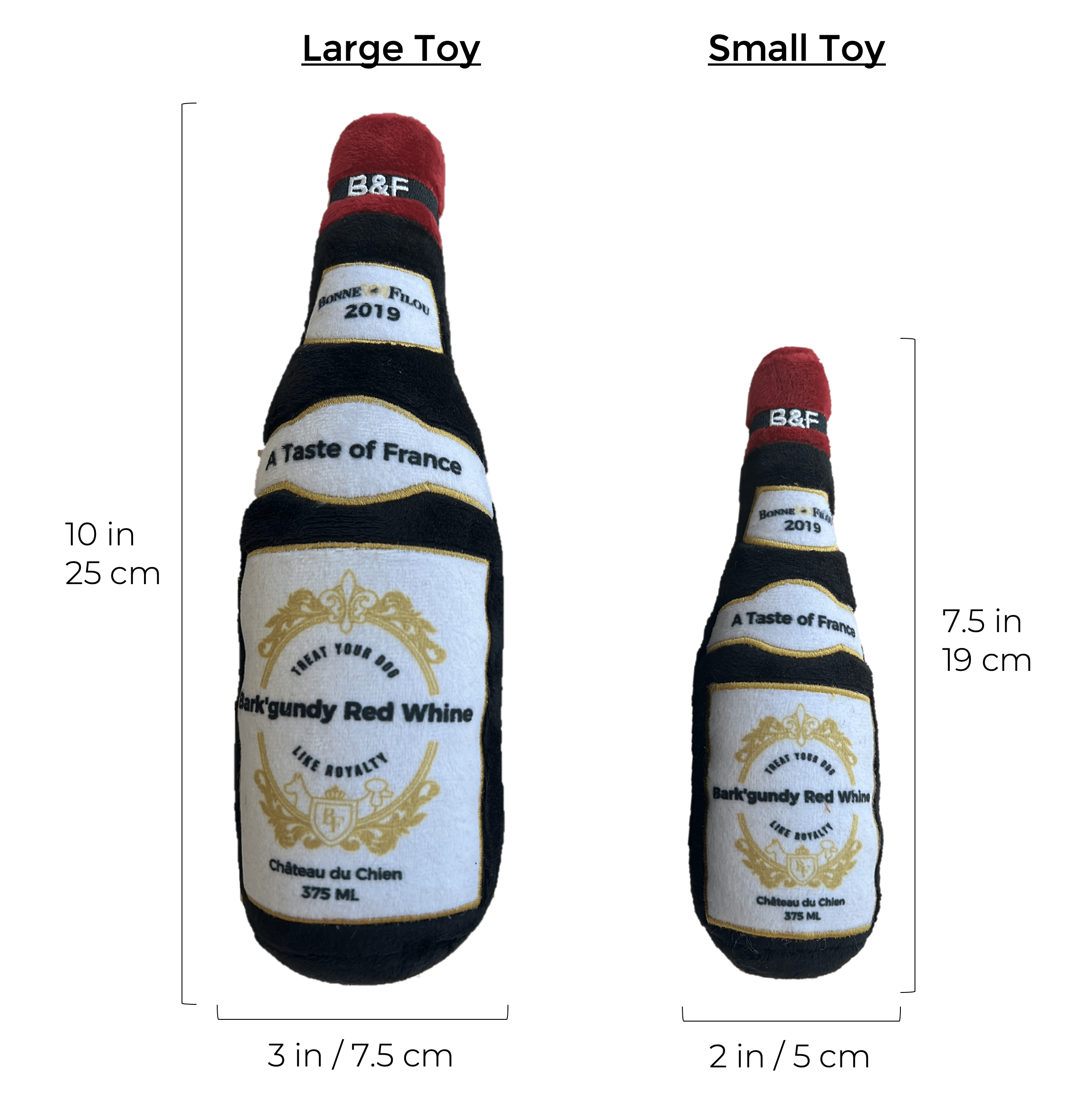 Bonne et Filou is now serving Red Whine All Day! Open a bottle of Bark'gundy Red Whine from our exclusive collection - the perfect toy for any occasion! The plush exterior is soft with an interior squeaker that will give your dog(s) hours of fun; while you can have your own glass of Burgundy (or Bordeaux; we don't judge) at home! Every Pampered Pup should have their own wine bottle; don't you think? Santé! Cheers!- Fun and Adorable Design: Your dog has its own version of a Burgundy wine bottle (only healthier) so you can share a drink with your furry friend! Perfect for fetching; snuggling or playing.- Ultra Soft Plush Material: Made from skin-friendly and incredibly soft; high-quality plush. Perfect for all breeds: small; medium and large dogs as well as for mild or aggressive chewers. (Always supervise your dog when playing.)- Tons of Fun: Contains a built-in squeaker that is protected by a layer of fabric to prevent it from ripping out. Creates endless hours of fun so your dog(s) never gets bored.- Unique and Fun Gift: This wine bottle plush toy is the perfect gift for any dog lover or dog birthday/puppy party.- Quick and Easy to Clean: This toy can be surface washed with cold water and air dried. However; please note that this plush toy is not indestructible.- Packaging is both in English and French.